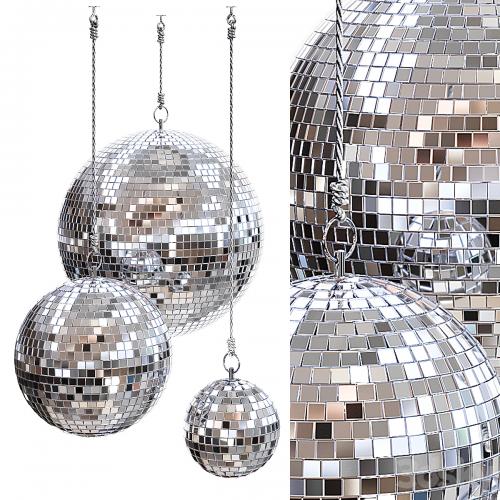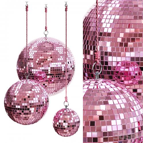 There are two sets of disco balls in the archive: classic chrome and tinted pink. Balloon diameters 30cm, 20cm and 10cm.