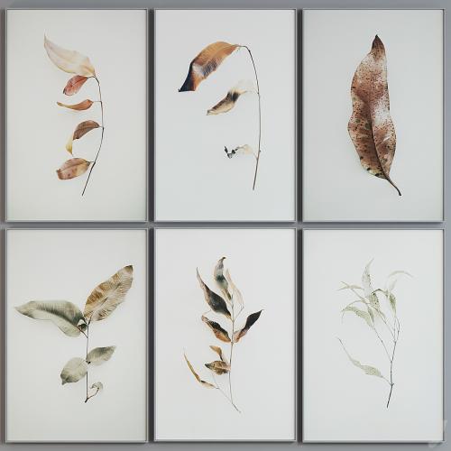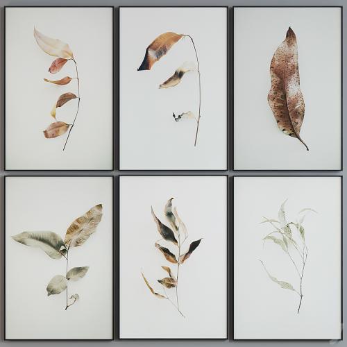 A set of 6 photo frames without a passe-partout with glass and a thin frame in a modern style with images of dry twigs with leaves.