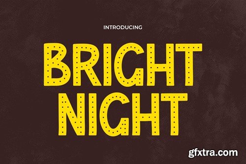 Bright Night is a font that embodies the lively spirit of retro design, infused with the vibrant essence of vintage disco and entertainment. This font is a captivating blend of nostalgia and energy, making it perfect for projects that demand a touch of fun and excitement. For logos, Bright Night brings a dynamic and eye-catching style, setting brands apart with its unique disco-era flair. The font's vintage charm is ideal for crafting memorable quotes, adding a sense of rhythm and liveliness that resonates with the audience. In invitations, Bright Night sets the stage for fun-filled events, creating an atmosphere of anticipation and joy. When applied to posters and greetings, it delivers messages with an engaging and upbeat vibe, capturing the essence of entertainment and good times. In the realms of packaging and branding, Bright Night offers a distinctive identity, perfect for products and brands aiming to convey a sense of fun and retro style. For book covers, event promotions, headlines, and advertising, Bright Night ensures your message stands out with its lively disco-inspired design, engaging viewers with its vintage charm and entertaining spirit.