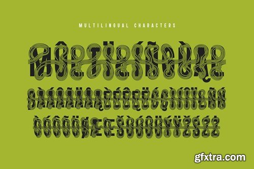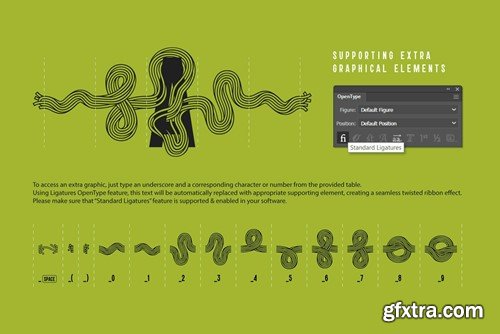 Hello! Presenting a creative font set — Twisted Ribbon. It's a vector decorative typeface with curved lines that are woven around the letters. The shape of the lines is made so that it flows seamlessly from one letter to another. To achieve an interesting effect, extra glyphs are added to this font, such as lines end or additional extension of a ribbon. To access an extra graphic, just type an underscore and a corresponding character from the provided table. Using Ligatures OpenType feature, this text will be automatically replaced with appropriate supporting elements, creating a seamless twisted ribbon effect (please make sure that the Standard Ligatures feature is supported & enabled in your software). Also, there are simple characters without a ribbon included in this font for most of the glyphs. Just enable the Stylistic Alternates OpenType feature to access them.