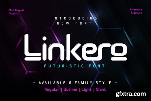 Linkero is a futuristic font that takes your designs to the next dimension. With its superior futuristic style, Linkero is the perfect solution for projects that demand a modern and innovative touch. Linkero's cutting-edge style is the best choice for web design, brand identity, and other creative projects with a future theme. The clarity of each letter creates a strong, contemporary look. Linkero has six style families such as Regular, Outline, Light, and Slant, providing extraordinary design flexibility. This font also supports multiple languages, making it a universal choice for your global audience. With Linkero, don't just compromise on sustainability, but imprint a futuristic signature on each of your projects. Discover unlimited design potential with this font. What’s Included: