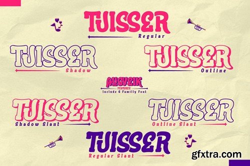 The Ausyeik font is a charming work of typographic art, designed specifically for projects that require a music-style display, festivals, and special events. The beauty that radiates from each character brings a magical touch to your designs. With a font family that includes regular, shadow, outline, and Slant, Ausyeik provides maximum flexibility for creating unique and memorable messages. But what makes it truly stunning are features like ligatures and alternates that give each letter an artistic and exclusive touch. This gives you unlimited creative freedom to come up with amazing designs. This font supports multiple languages, making it the perfect choice to reach a global audience. With each letter, Ausyeik brings an unrivaled feeling of euphoria and joy, bringing the atmosphere of festivals and special events to life in your designs. So, if you are looking for a font that celebrates the musical style in all its glory, Ausyeik is the best choice that you will never regret.