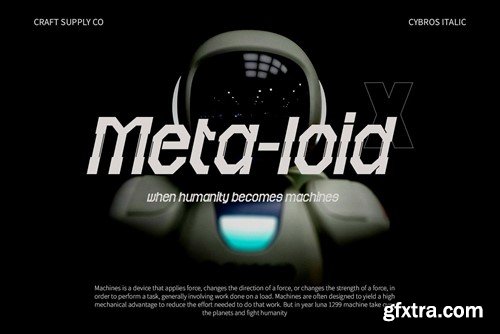 Cybros: Embracing the Future in Typography Innovative Futuristic Design Cybros pushes the boundaries of display typography with its innovative design inspired by futuristic elements. Its sleek lines and geometric shapes evoke visions of tomorrow’s technology and innovation. Forward-Thinking Inspiration Drawing inspiration from the possibilities of tomorrow, Cybros embodies the essence of futuristic concepts, from artificial intelligence to space exploration. Its design reflects a forward-thinking approach to typography. Perfect for Cutting-Edge Projects Tailored for cutting-edge projects, Cybros excels in applications requiring a futuristic aesthetic. Whether used in sci-fi films, tech startups, or digital interfaces, its futuristic theme adds a dynamic and contemporary touch. Versatile and Impactful Beyond its thematic appeal, Cybros offers versatility in its application. From branding to editorial design, its futuristic vibe captivates audiences and leaves a lasting impression. Shaping Tomorrow’s Typography Cybros emerges as a beacon of innovation in the world of typography, embracing the themes of futurism and pushing the boundaries of design. With its sleek lines, geometric shapes, and forward-thinking inspiration, Cybros sets the stage for tomorrow’s visual communication. Experience the future of typography with Cybros. What you get : Features : If you have any inquiries or need assistance, please feel free to contact us. We appreciate your support in enhancing your creative projects! Best regards, Craft Supply Co.