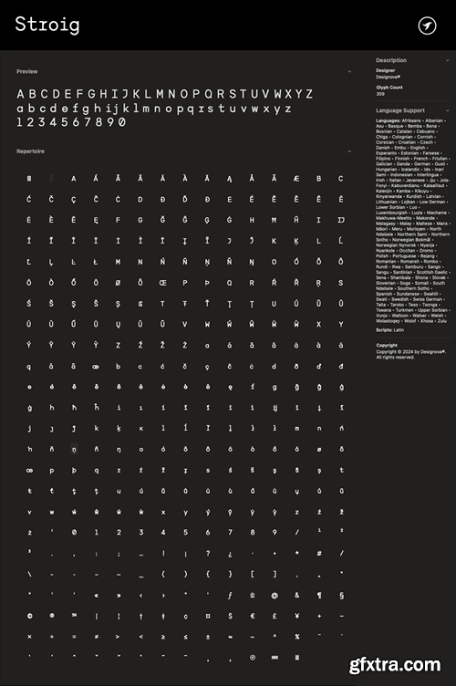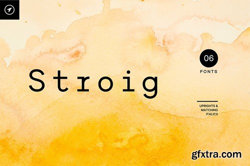 The STROIG family contains a total of 6 fonts featuring three weights (Light / Regular / Bold) with uprights and italics equivalent of each weight. Each weight includes extended language support including Western European & Central European sets. A total of 359 glyphs are included. The pack contains OTF, TTF as Desktop fonts, and optional Web Fonts (all EOT, SVG, TTF, WOFF, and WOFF2 formats included).