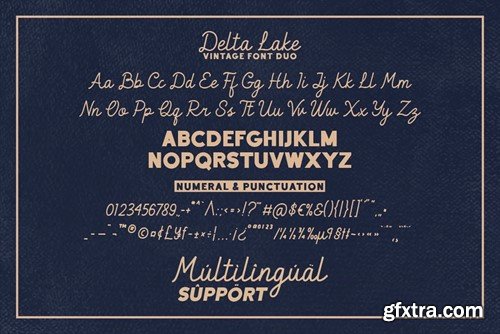 Delta Lake is a beautiful vintage script font paired with a sans-serif font. There are 4 styles available for you to choose from to add a vintage touch to any project. File Includes: Features: Stylistic Alternate, Ligature, Swashes, Multilingual & PUA Encoded Thank you :)