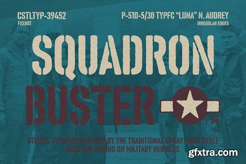 Squadron Buster is a bold and rugged stencil typeface that draws inspiration from the gritty world of military coding and markings. This distinctive typeface is a nod to the traditional spray paint style used for labeling and coding on military weapons, ammunition, and vehicles. With its irregular edges and robust character, Squadron Buster encapsulates the essence of no-nonsense military design. What you get : Features : In conclusion, Squadron Buster is a rugged and distinctive stencil typeface that embodies the spirit of military coding and markings. With its irregular edges and bold character, it adds an authentic and impactful touch to a wide range of design projects, making it an excellent choice for designers seeking a unique and gritty typeface.