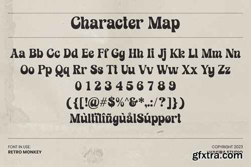 Say hello to new serif font, Retro Monkey! Retro Monkey is a display serif font that delivers a classic retro feel with strength and boldness. Characterized by striking bold letters, Retro Monkey exudes elegance and uniqueness in every detail. Its retro-inspired design evokes nostalgia and conveys a strong and charming style. Retro Monkey's lettering proportions are audacious in their clarity and legibility. With bold lines and strong contours, each letter looks tough while retaining the elegance of a retro aesthetic. Consistent letter thickness provides an appealing visual appeal and is easily recognizable. Retro Monkey is suitable for use in various design projects that want a strong retro classic impression. This font makes a perfect choice for headlines, titles, posters, merchandise designs, and more. In any context, Retro Monkey carries an impressive presence, inviting the audience to feel nostalgia for a different era. Here's what you get: Multilingual character supports : (Afrikaans, Albanian, Catalan, Croatian, Czech, Danish, Dutch, English, Estonian, Finnish, French, German, Hungarian, Icelandic, Italian, Lithuanian, Maltese, Norwegian, Polish, Portuguese, Slovenian, Spanish, Swedish, Turkish, Zulu) Follow my shop for upcoming updates, and for more of my work, Thank you!