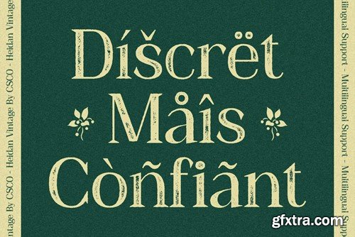 Heidan Vintage: A Nostalgic Display Typeface Serif Elegance with High Contrast Heidan Vintage features striking high-contrast serifs that exude elegance and sophistication. Its bold strokes and delicate details add a touch of refinement to any design project. Vintage Vibes with Stamp Rough Effects Inspired by vintage aesthetics, This font incorporates rough stamp effects, giving it a nostalgic charm reminiscent of old-fashioned letterpress printing. Each character carries the allure of bygone eras. Perfect for Display Purposes Tailored for display use, This font shines in various applications, from posters and packaging to branding and editorial design. Its distinctive appearance grabs attention and makes a lasting impression. Versatile and Timeless Appeal Beyond its vintage-inspired look, This font offers versatility and timeless appeal. Whether used for retro-themed projects or contemporary designs seeking a touch of nostalgia, it delivers impactful results. Timeless Elegance This font stands as a testament to timeless elegance and vintage charm. With its high-contrast serifs and stamp rough effects, it adds a touch of nostalgia and sophistication to any display project, ensuring it stands out with captivating allure. What you get : Features : For any inquiries or assistance, please don’t hesitate to get in touch. We appreciate your support in making your creative projects shine! Best regards, Craft Supply Co.