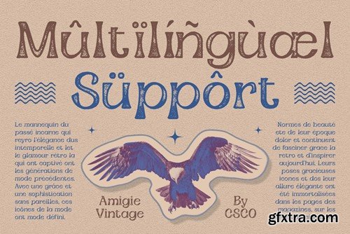 Amigie Vintage: Embracing Vintage Elegance Classic Serif Design Amigie Vintage features a distinctive serif design characterized by elegantly curved serifs that extend seamlessly from the stems. This classic serif style adds a touch of refinement to any project. Rough Stamp Drawn Effect The font is imbued with a unique rough stamp drawn effect, lending it a vintage and handcrafted feel. Each character carries the charm of imperfection, reminiscent of traditional printing techniques. Vintage Appeal With its combination of serif elegance and rough stamp drawn texture, This font exudes a timeless vintage appeal. It evokes nostalgia and authenticity, making it ideal for projects seeking a retro aesthetic. Versatile Display Font This font is a versatile display font suitable for a wide range of applications. Whether used in branding, packaging, posters, or invitations, its vintage-inspired style adds character and sophistication to any design. Timeless Elegance with a Vintage Twist This font offers a perfect blend of classic serif design and vintage-inspired rough stamp drawn texture. Its elegant curves and authentic vintage appeal make it a standout choice for designers looking to infuse their projects with timeless charm and character. What you get : Features : For any inquiries or assistance, please don’t hesitate to get in touch. We appreciate your support in making your creative projects shine! Best regards, Craft Supply Co.