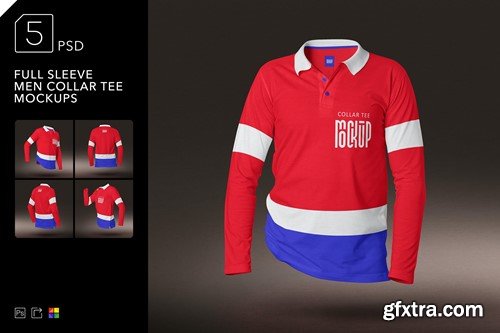 These full sleeve men collar tee mockups allow designers and marketers to preview their designs in a realistic manner. These mockups feature 5 full-sleeve t-shirt with a collar, showcasing how the design would look when printed on an actual t-shirt. With the use of these men's collar tee mockups, designers can save time, resources and reduce the risk of printing errors.
