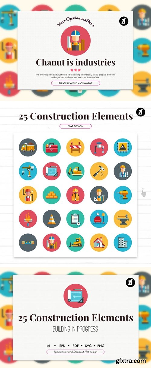 Who is Chanut is industries? - We are designers and illustrators who creating illustrations, icons, graphic elements and expected to deliver our works to finest website that full of top-quality features. More than well crafted 10,000 vector files were contributed to marketplaces that we carefully selected. 25 Construction flat elements This pack was perfectly crafted by one of our talented artist who who come with 10 years experience in this field.