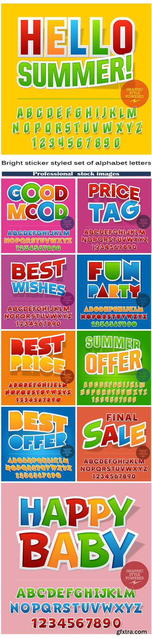 Bright sticker styled set of alphabet letters, numbers and punctuation symbols